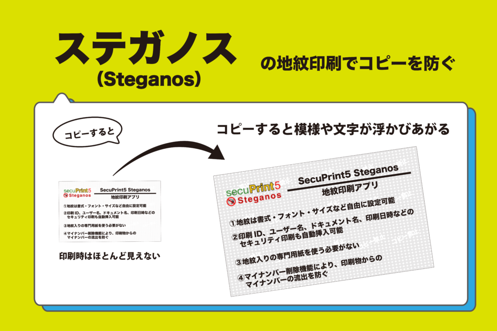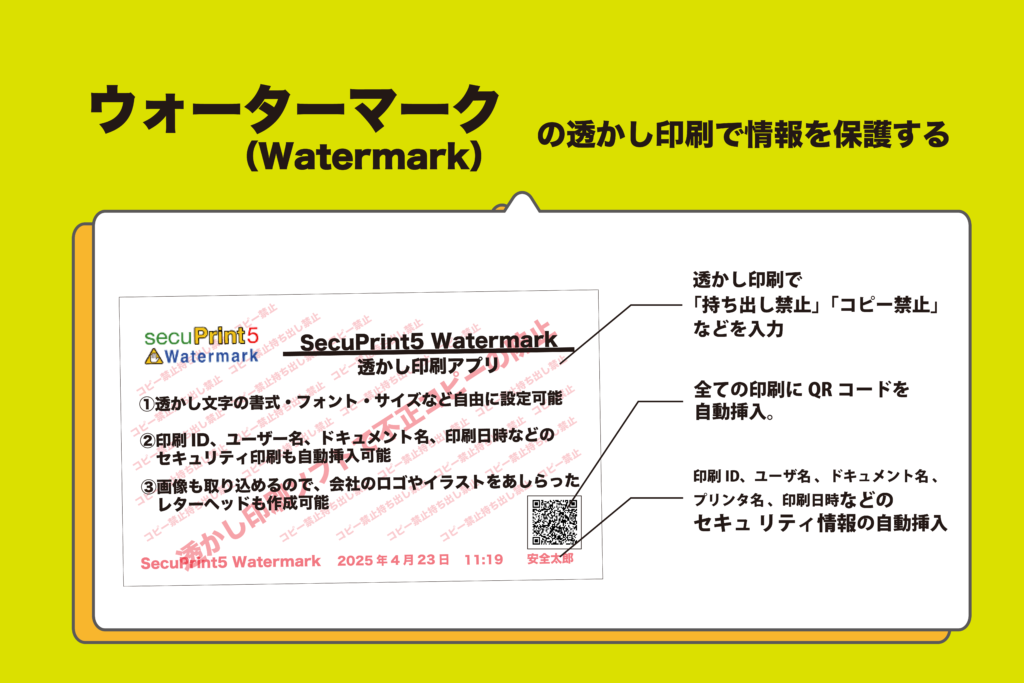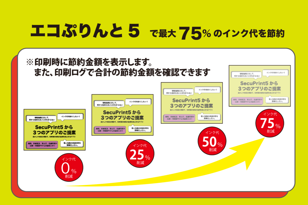 印刷物の情報漏洩を防止するアプリ" SecuPrint5" 印刷物のセキュリティを高めて、インクを節約する事で、安心・安全に印刷が可能に。「透かし印刷で印刷物の不正コピーを防止し、エコプリントで透最大75%のインク代の節約、地紋印刷で不正コピーを防止する。 透かし印刷 エコプリント印刷 地紋印刷 詳しくはこちら